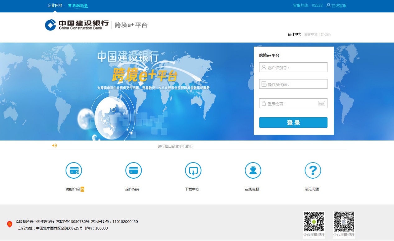 中国建设银行跨境电商网上银行(跨境电商版)是结合跨境电商客群特征,量身定制的一站式在线综合金融服务平台。为跨境电商企业提供涵盖支付结算、贸易融资、外汇交易、收支申报、关税缴款等在内的全流程在线集成服务。通过与杭州跨境电商综试区“单一窗口”直联,实现数据互联互通,客户足不出户即可在线享受各项跨境金融服务。